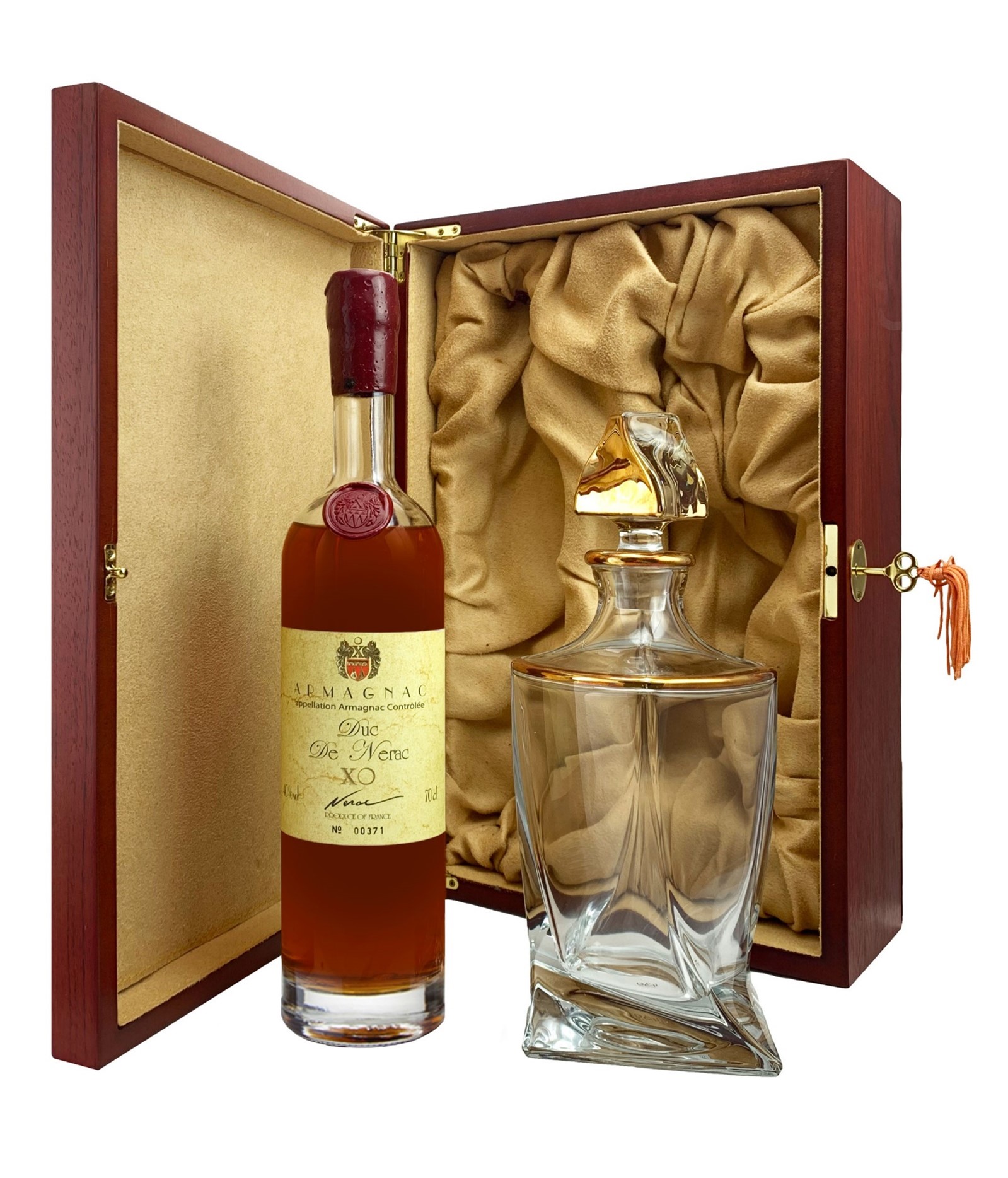 Armagnac Du de Nerac XO de 20 ans d’âge, créé et élaboré par Cognac Jean Cavé (A.O.C. Bas Armagnac, Gers en Gascogne). Chaque bouteille de 70cl style Ariane est numérotée et scellée à la cire. Le coffret de luxe est en bois exotique, avec serrure à clé. L’intérieur est feutré et façonné pour épouser son contenu. Le décanteur est en crystal de Bohême, avec accents en or.