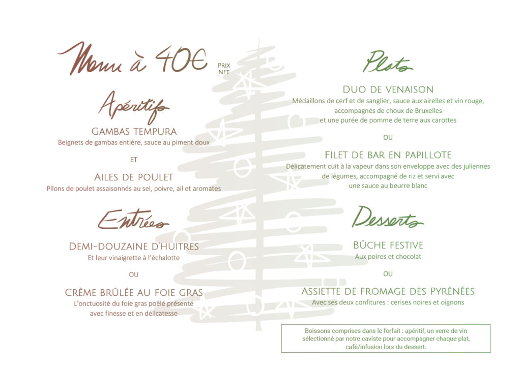 Le Mont d’Aure sera ouvert le soir du 24 et le midi du 25 décembre sur réservation uniquement. Nous vous proposons un menu en 4 étapes à 40€ par personne (voir plus bas).